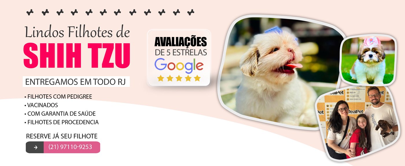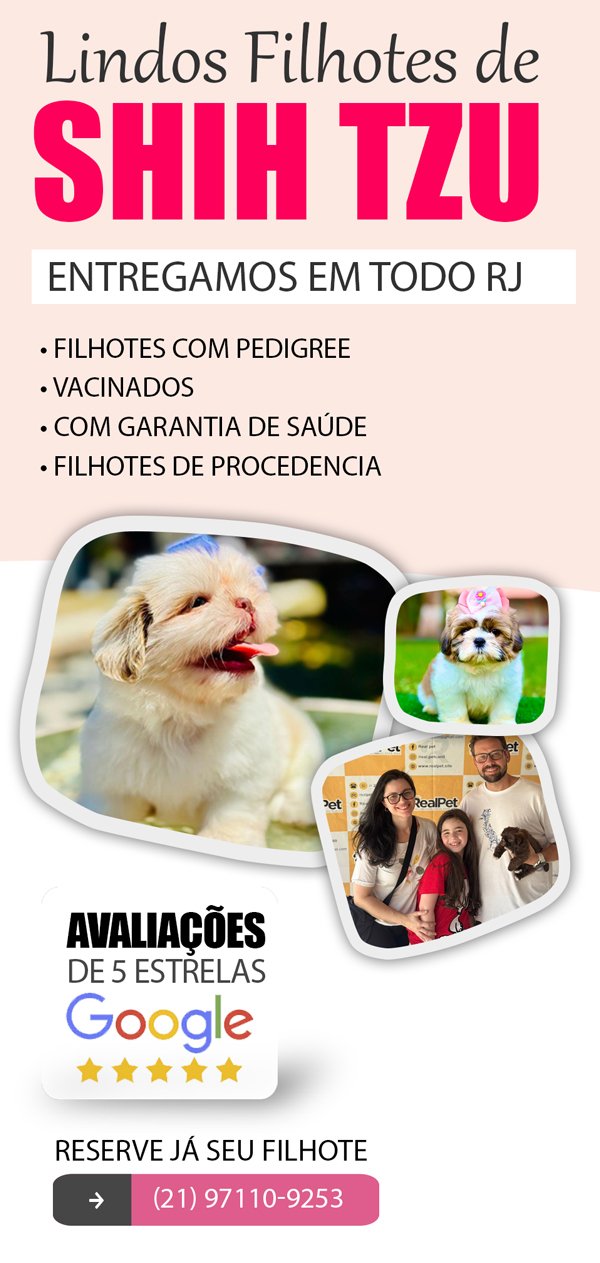 Publicado em Dara BenevidesTrustindex verifica se a fonte original da avaliação é Google. Pet lindo, trouxeram a noite no mesmo dia que pedir, veio todo limpinho, contrato certinho, tudo ok! Super recomendo!Publicado em Núbia XavierTrustindex verifica se a fonte original da avaliação é Google. Maravilhoso Canil, tudo muito bem organizado. Recomendo super!Publicado em Fernanda AraujoTrustindex verifica se a fonte original da avaliação é Google. Boa tarde!!! Eu super indico a Real Pet, Adriana e sua equipe são excelentes, desde a procura e aquisição da minha Nina, tive total acessoramento...super profissional e humana e dá atenção e assistência toda vez que solicitamos. Eu e minha família estamos muito felizes com a nossa Nina, no nosso lar...costumo dizer que a Nina é como pedi a Deus. Nina está com 4 meses e até hj tenho contato com a Adriana...quem adquirir seu pet com a Real Pet jamais se decepcionará. Obrigada Adriana e sua equipe por nos proporcionar esse presente.❤️😍🐶😍🐶❤️Publicado em sonia cardoso moreira garciaTrustindex verifica se a fonte original da avaliação é Google. Excelente!!!!!Publicado em Jose Ricardo RicardoTrustindex verifica se a fonte original da avaliação é Google. Estou muito feliz com o cachorrinho que adquirir que agora virou um filhinho meu. Obrigado pelo atendimento e o carinho. Feliz NatalPublicado em Junior OliveiraTrustindex verifica se a fonte original da avaliação é Google. Temos 3 Shitzus com a família RealPet, obrigado por tudo!Publicado em Jéssica LoboTrustindex verifica se a fonte original da avaliação é Google. Tivemos uma ótima experiência com o RealPetCanil. Ótimo atendimento, antes da compra, durante e após tb. Esclareceram todas as nossas perguntas prontamente. Trabalho realizado com mt amor, zelo e responsabilidade. Nossa Amora veio cheia de saúde e mt sapeca, enchendo nossa família de alegria.Publicado em RhayzaTrustindex verifica se a fonte original da avaliação é Google. Melhor escolha para comprar minha filha lindona, Doralice. Gostaria de agradecer em especial a Adriana, por todo carinho, atenção, comprometimento e amor. Vc foi maravilhosa desde o início. Recomendo de olhos fechados. O melhor canil de todos. Parabéns a todos pelo empenho e dedicação.Publicado em luiz olyntho guedes pintoTrustindex verifica se a fonte original da avaliação é Google. Adoramos o atendimento, o cãozinho lindo e bem cuidado, muita felicidade na nossa casa.